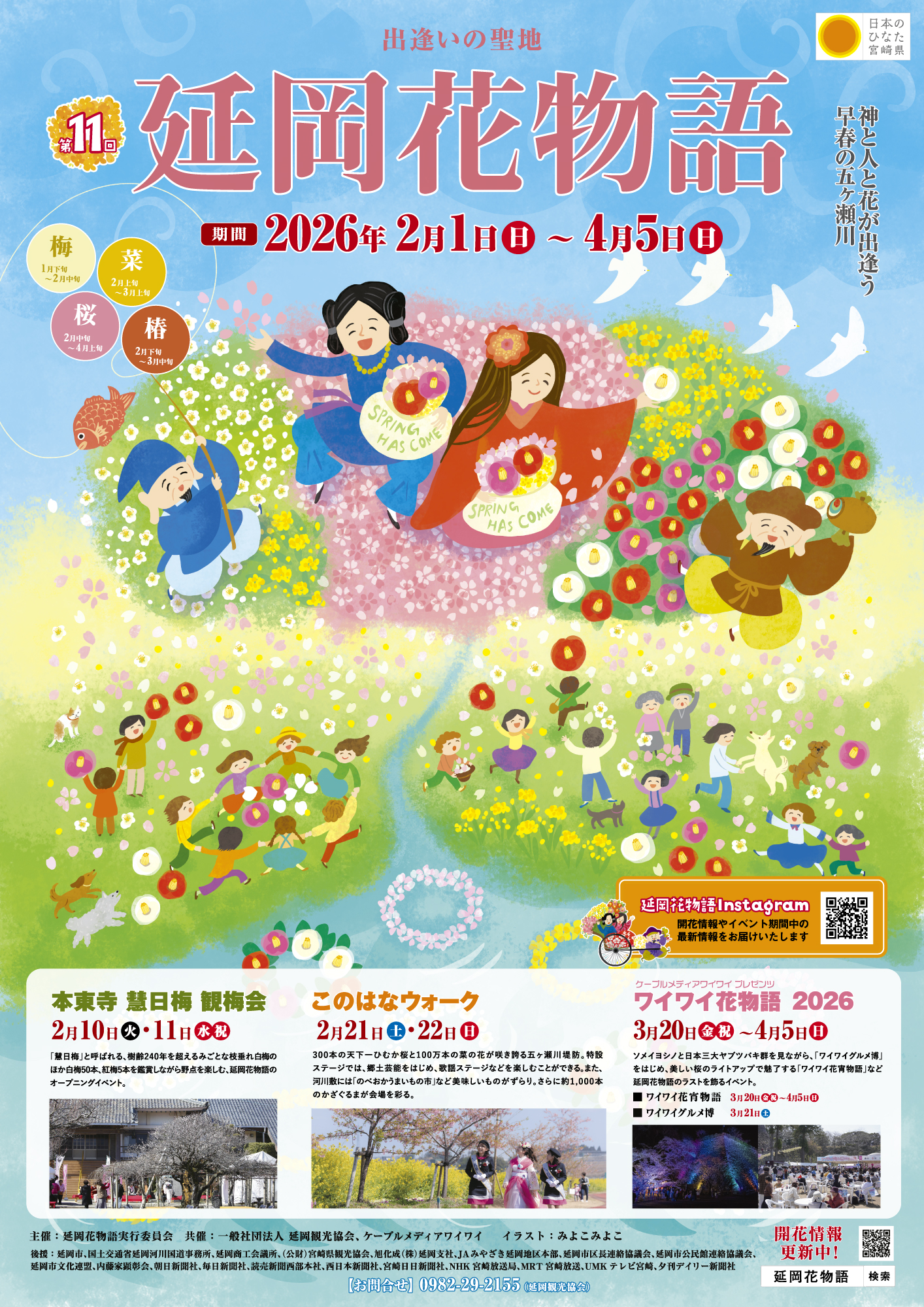 第11回 延岡花物語開催のご案内 2026/01/20お知らせstaff 第11回 延岡花物語を 2026年2月1日(日)〜4月5日(日)の期間にて開催いたします。 今年度より公式Instagramも開設いたしましたので、サイト混雑時やイベント中のリアルタイムなお知らせをお見逃しなく! https://www.instagram.com/nobeokahanamonogatari/