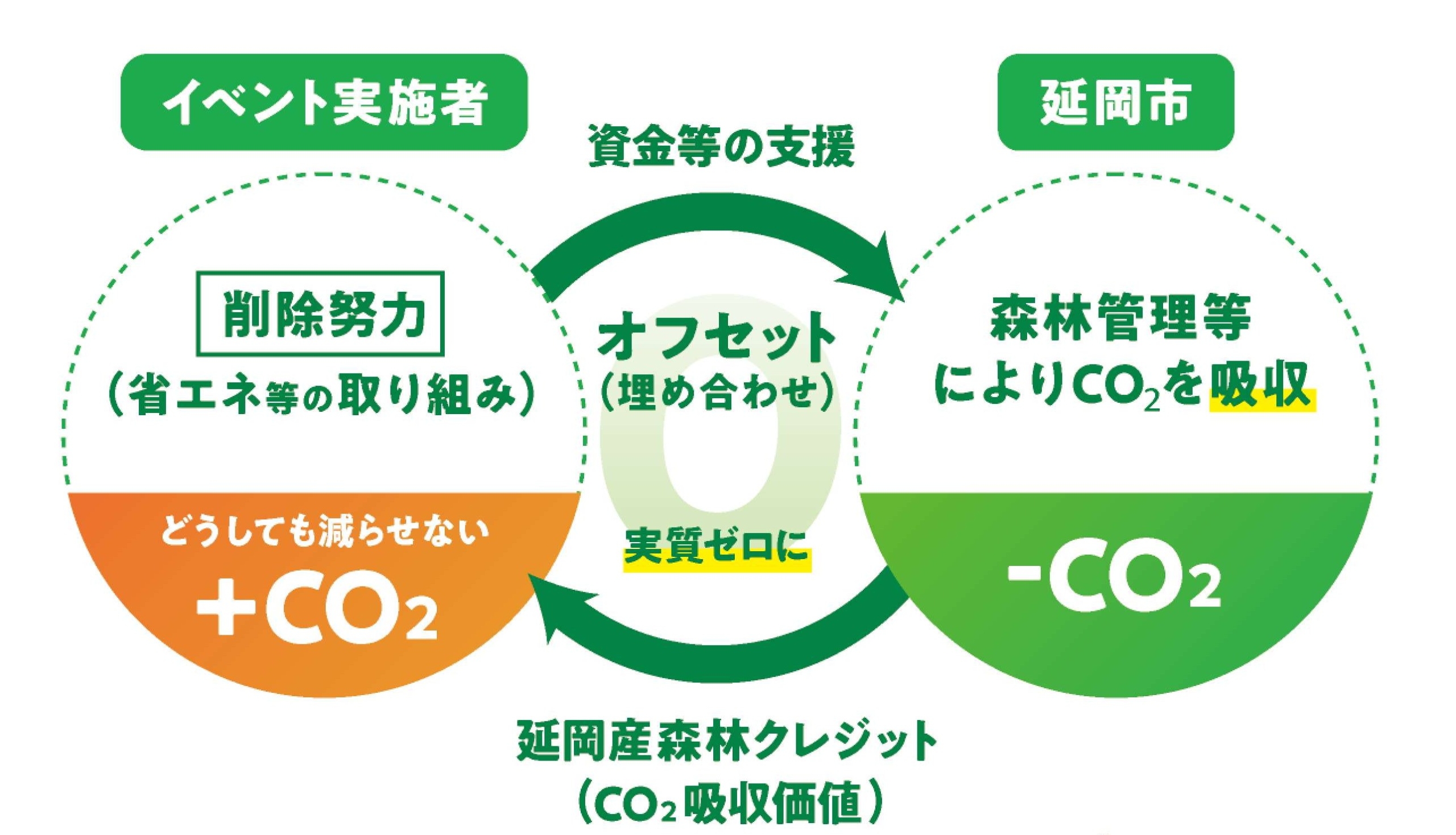 2026年のこのはなウォークでは、グルメイベント出店者やステージイベント出演者の移動により排出されるCO₂を延岡の森林から創出された「J-クレジット」で相殺する取組(カーボン・オフセット*)を行っています。