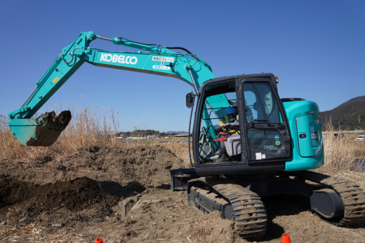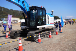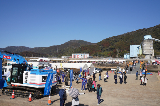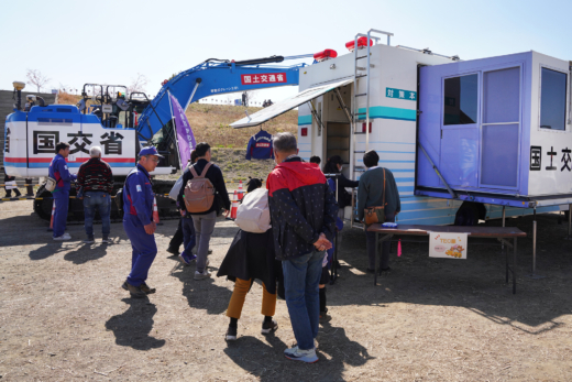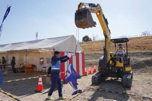 国土交通省 延岡河川国道事務所のブースでは、昨年に引き続き、土木業界PRを行なっています。ショベルカーに試乗したり、バーチャル映像の世界を体験できたり、浸水ドアで浸水時の水の圧力を体験したりなど、さまざまな体験コーナーがあります。