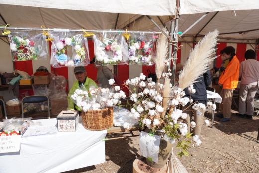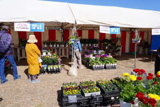 様々な花の販売や展示をはじめ「たねダンゴ」のプレゼントを行うイオンブース、工芸体験などの教室があるワークショップブース、手づくりコットンリースを購入できたりコットンのタネをもらえる「コットンプロジェクト」があるエリアです。