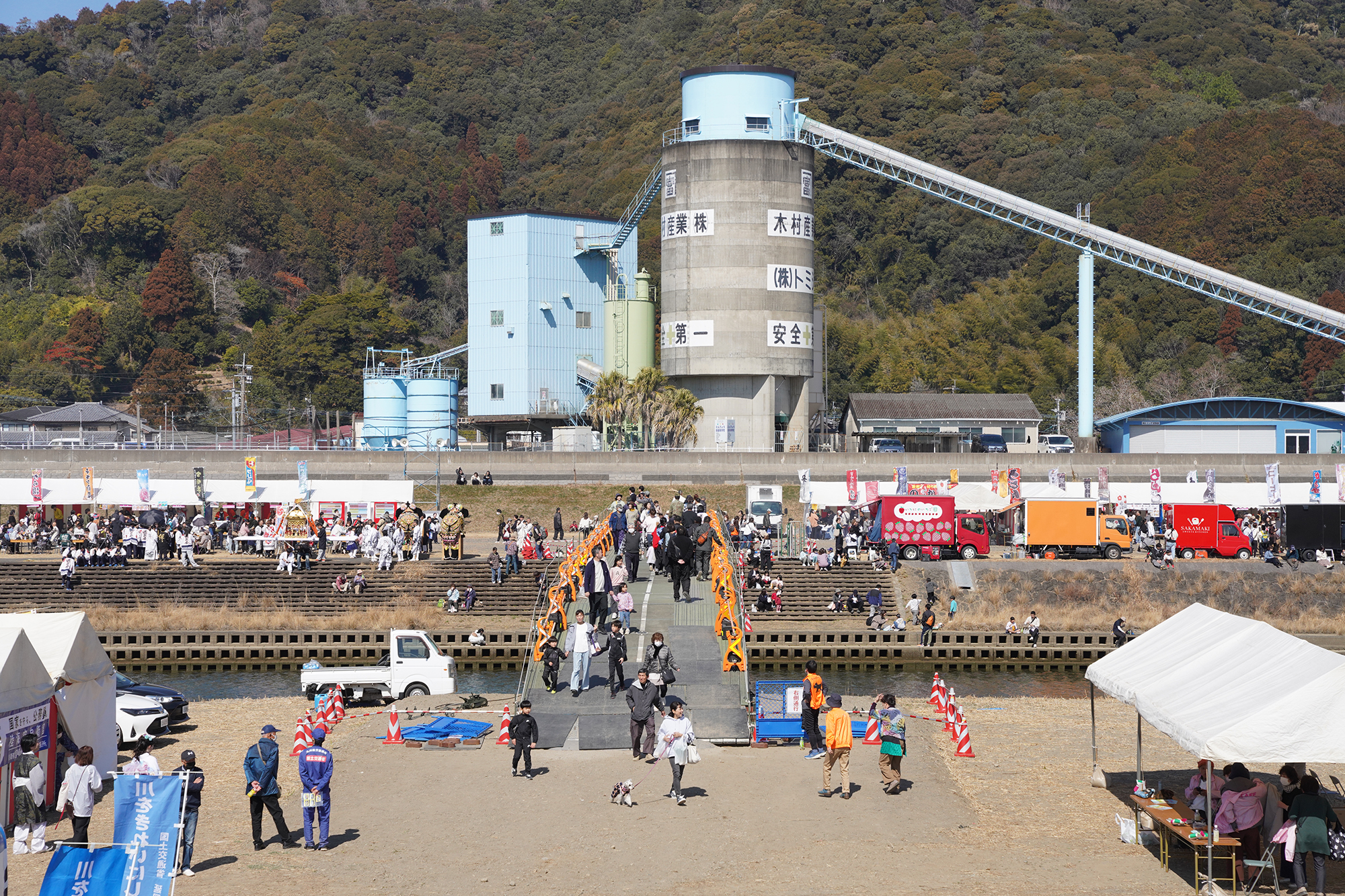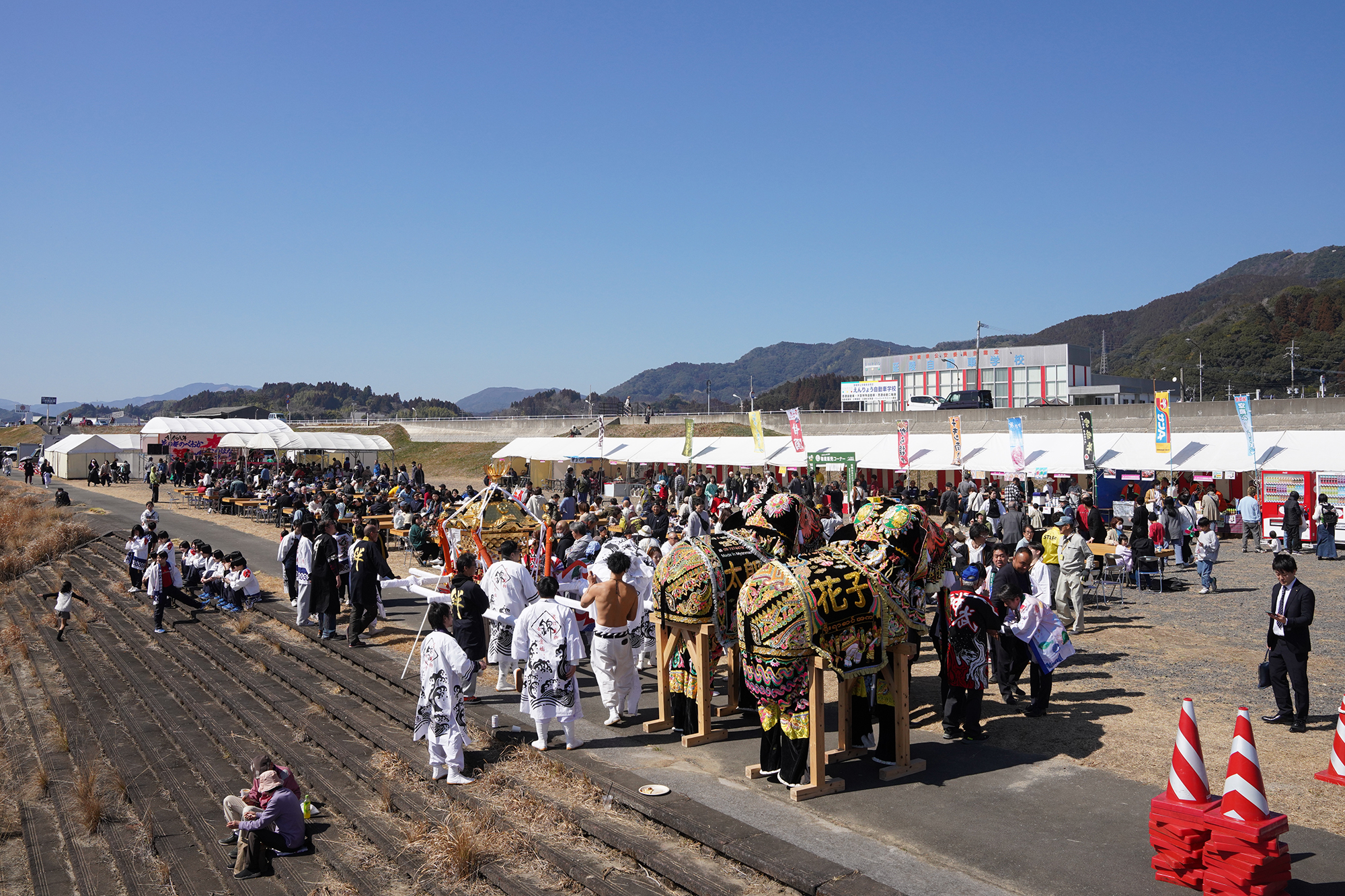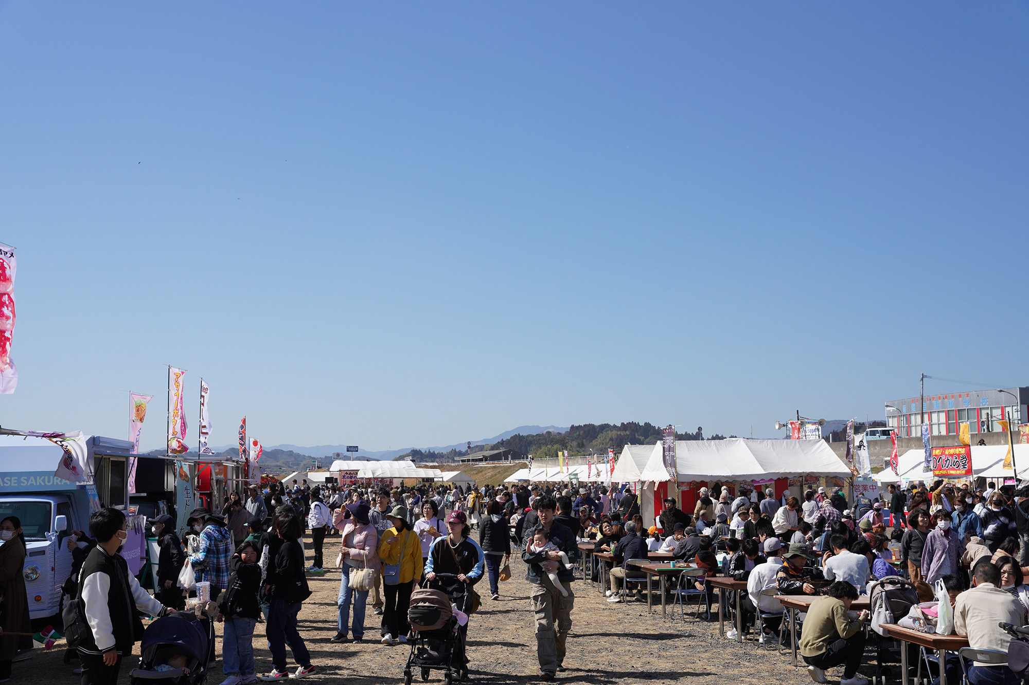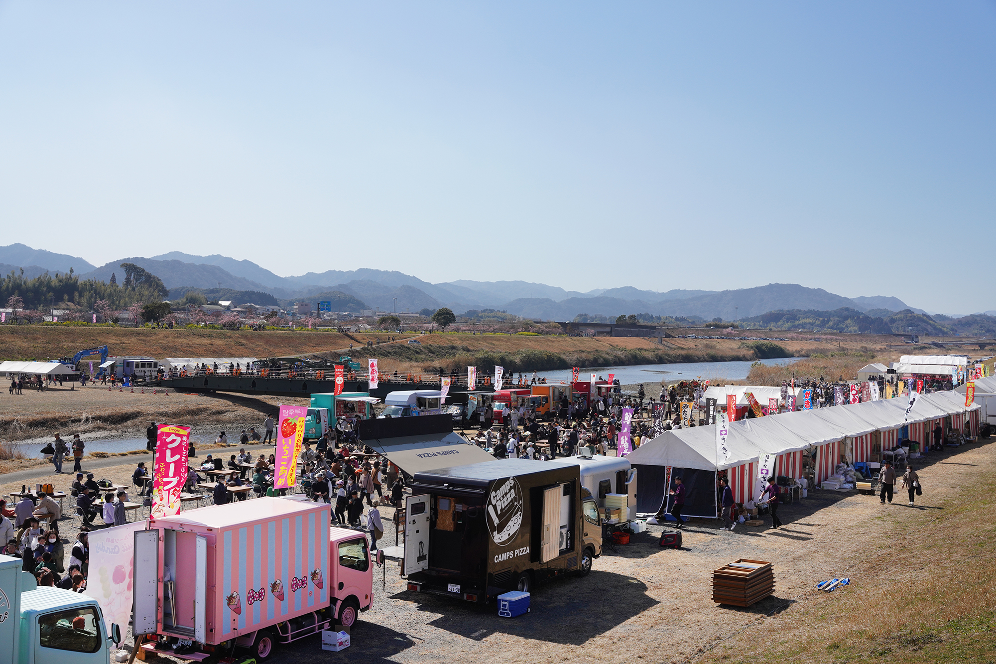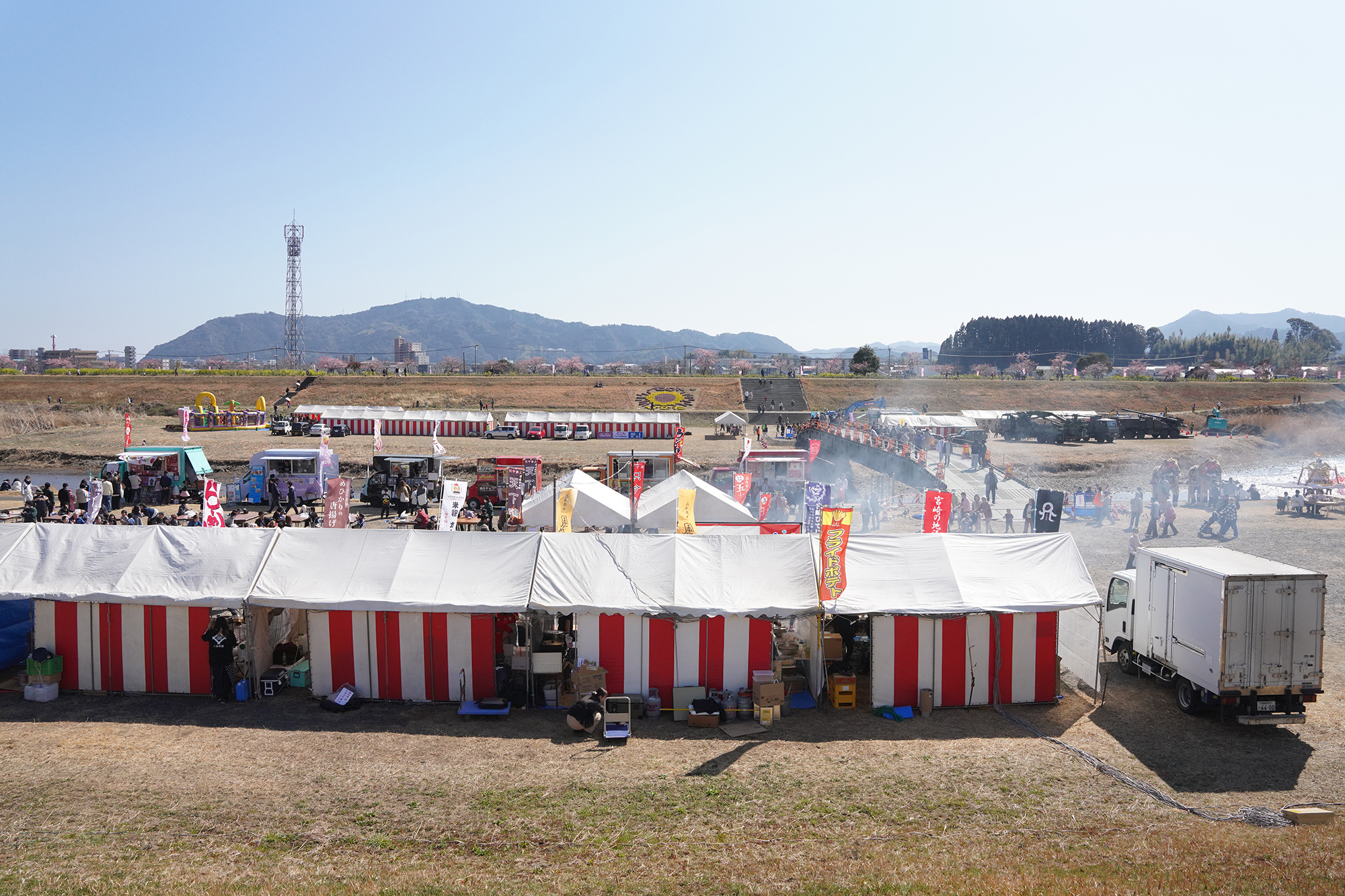 会場の左岸(下流に向かって左側)のエリアはステージイベントと延岡自慢のグルメがずらりと並ぶ「のべおかうまいもの市」、右岸エリアでは、イオン延岡店、多々良店、ホームワイド出北店のご協力による巨大花文字アートや、延岡市内の中学生が手作りしたかざぐるま1,000本の展示、延岡茶道連盟による野点、人力車体験、ワークショップ、自衛隊と国交省による体験コーナー、キッズイベント等など、様々な企画が行われました。