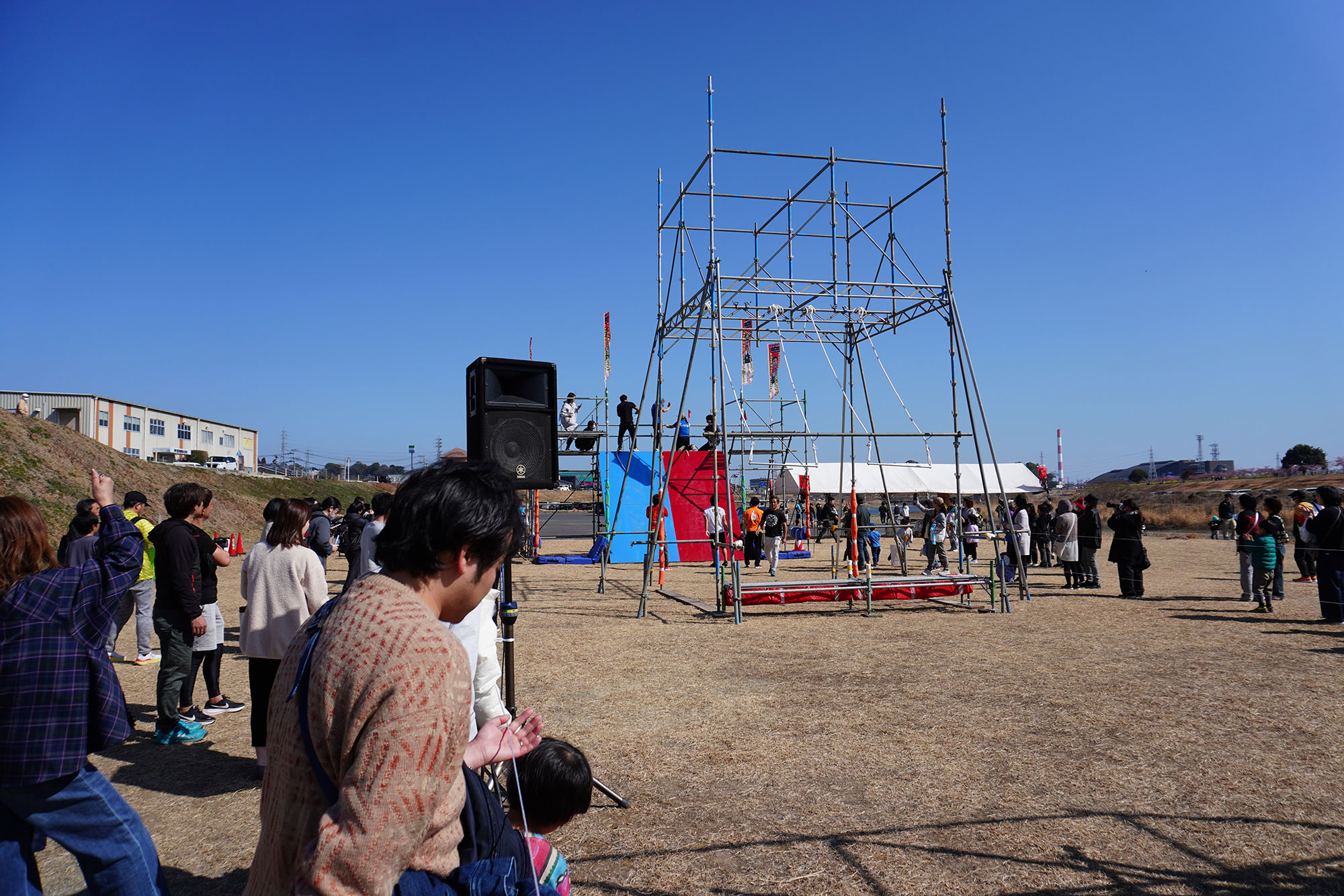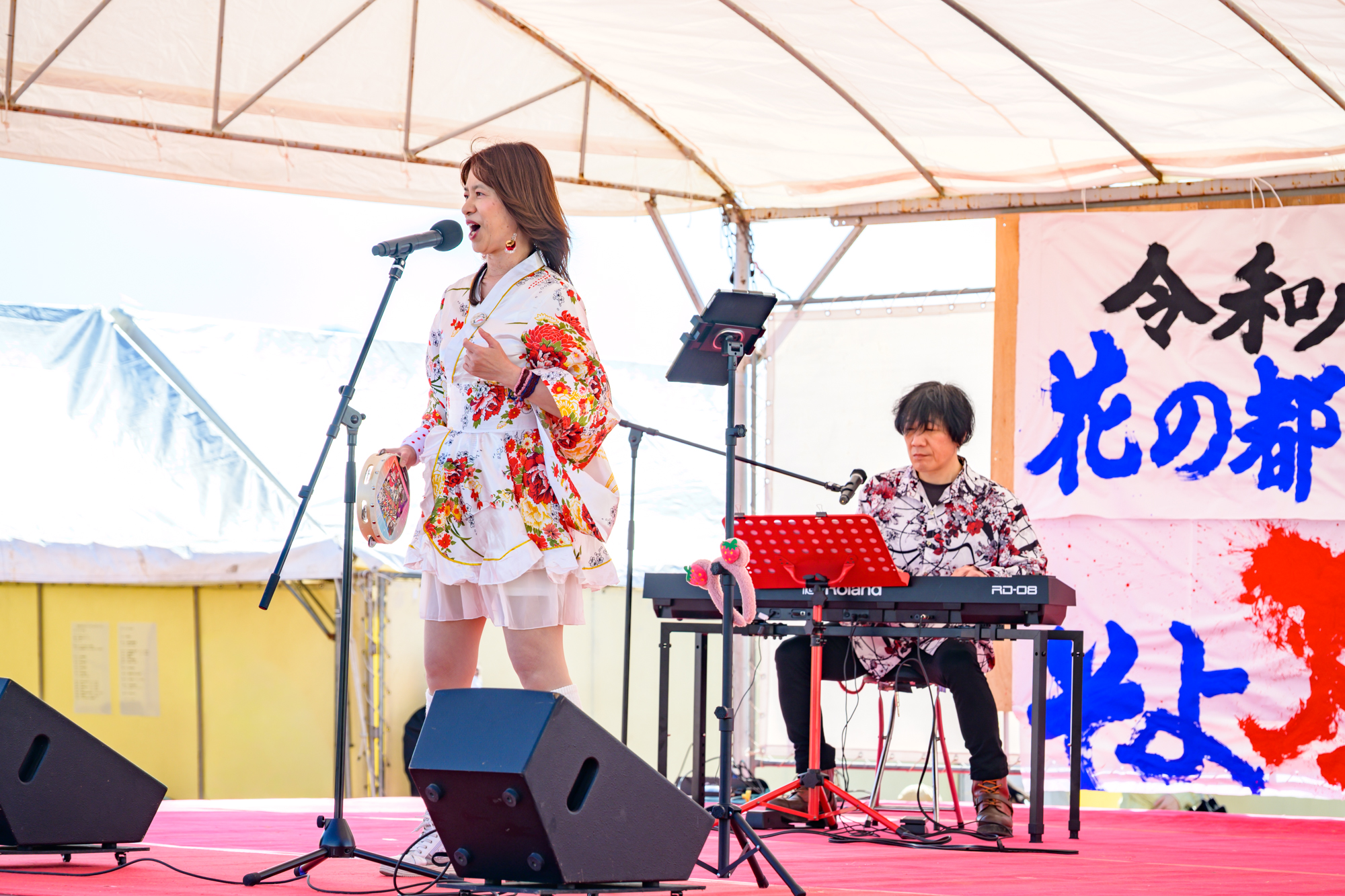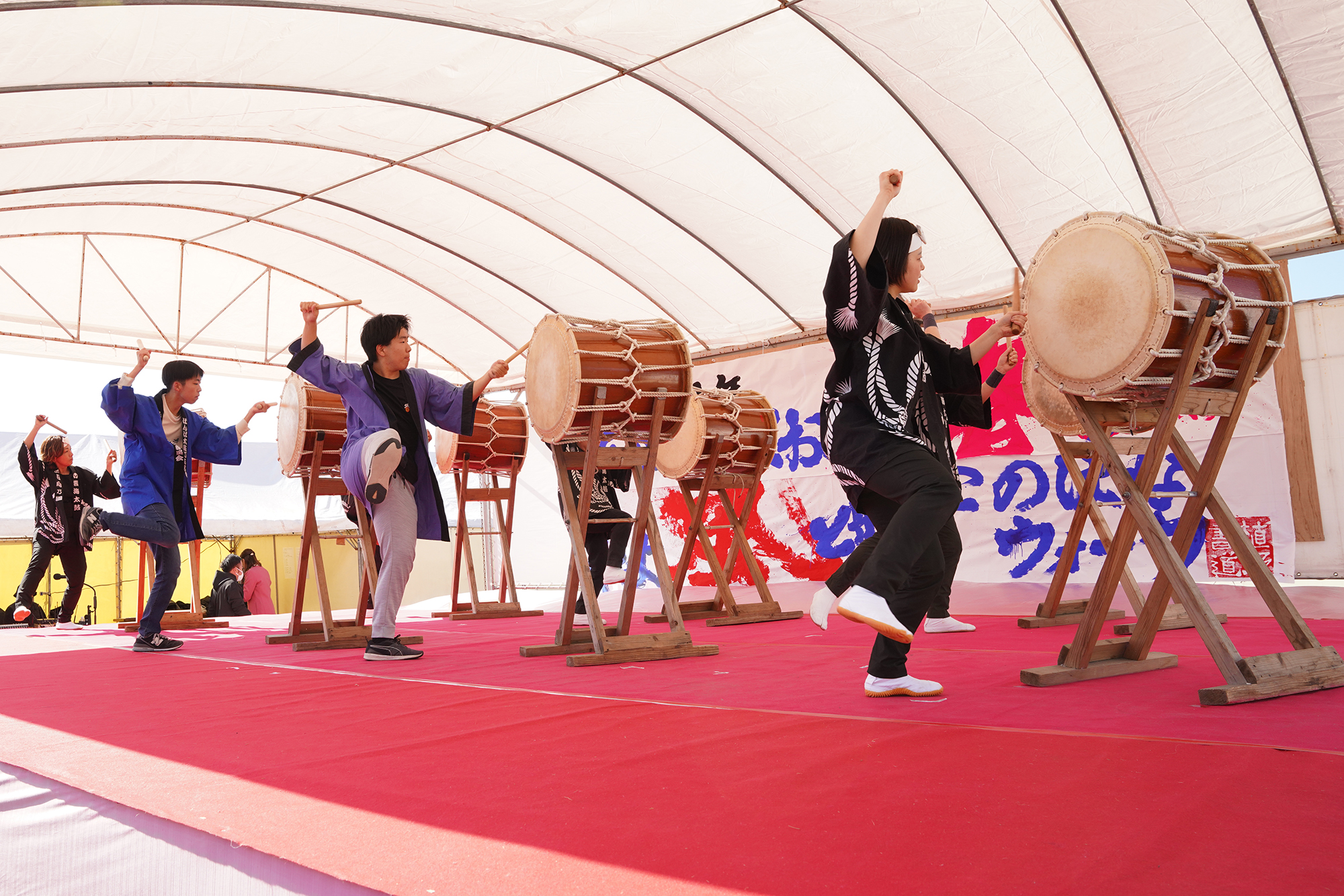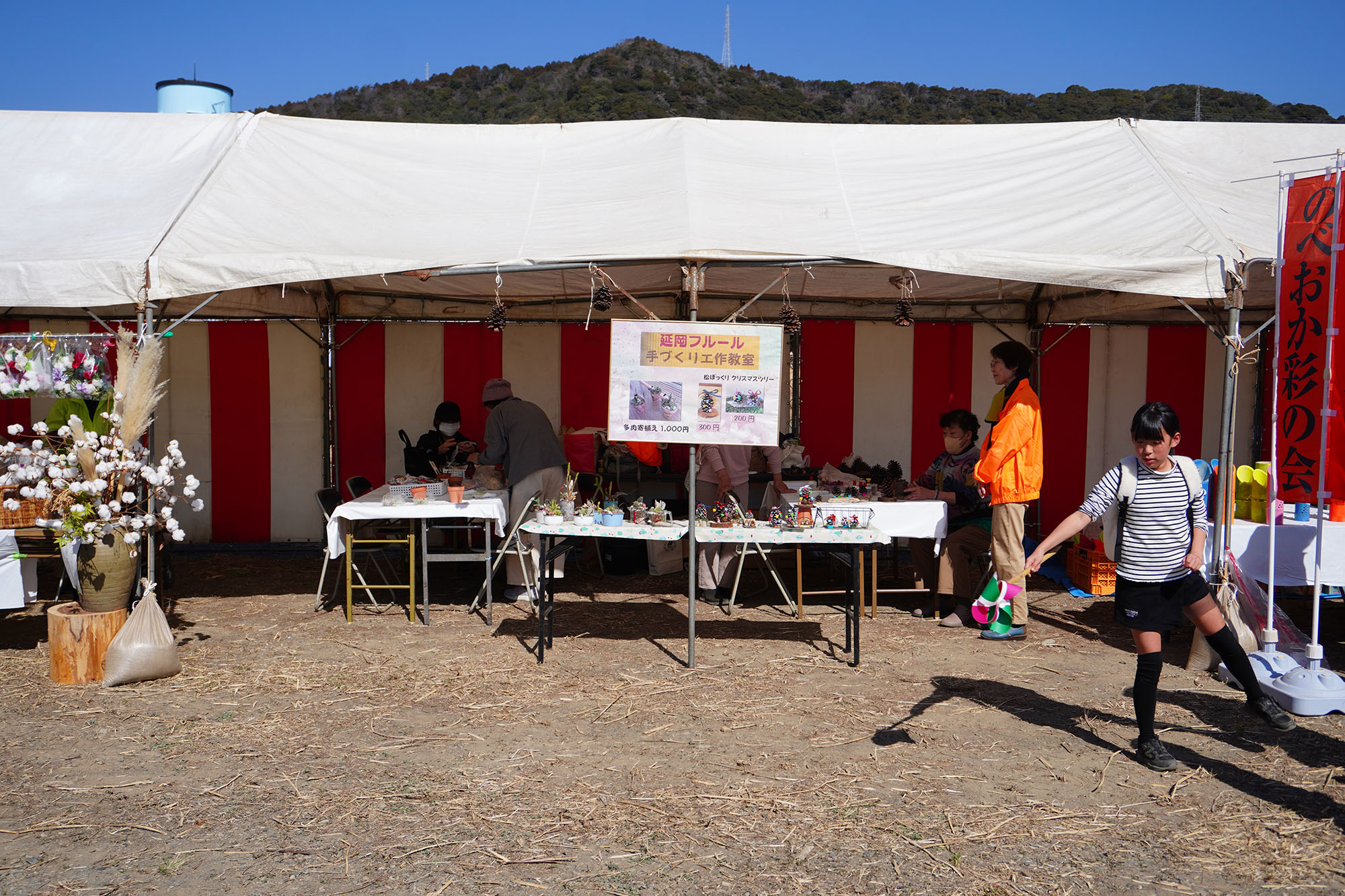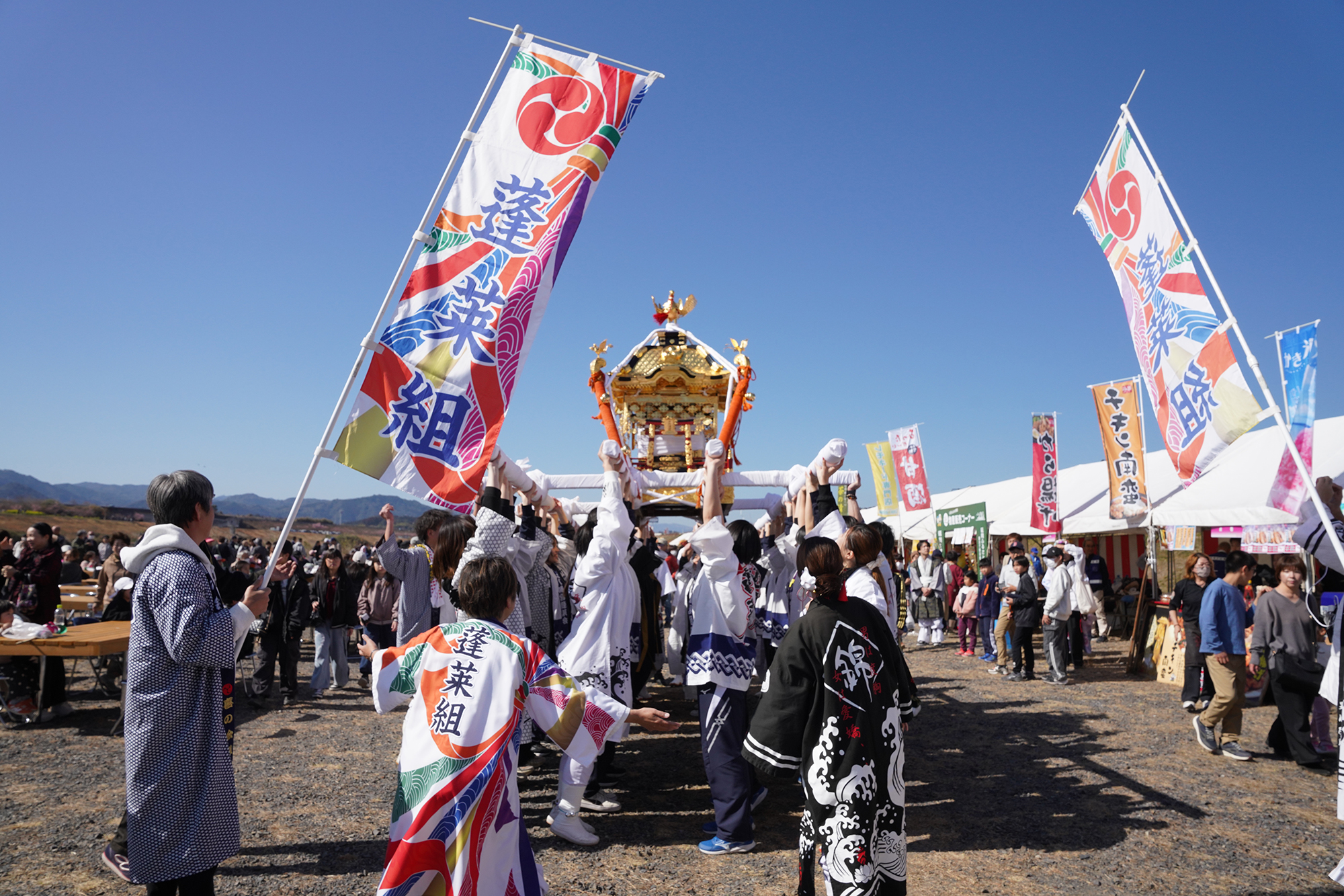 会場の左岸(下流に向かって左側)のエリアはステージイベントと延岡自慢のグルメがずらりと並ぶ「のべおかうまいもの市」、右岸エリアでは、イオン延岡店、多々良店、ホームワイド出北店のご協力による巨大花文字アートや、延岡市内の中学生が手作りしたかざぐるま1,000本の展示、延岡茶道連盟による野点、人力車体験、ワークショップ、自衛隊と国交省による体験コーナー、キッズイベント等など、様々な企画が行われました。