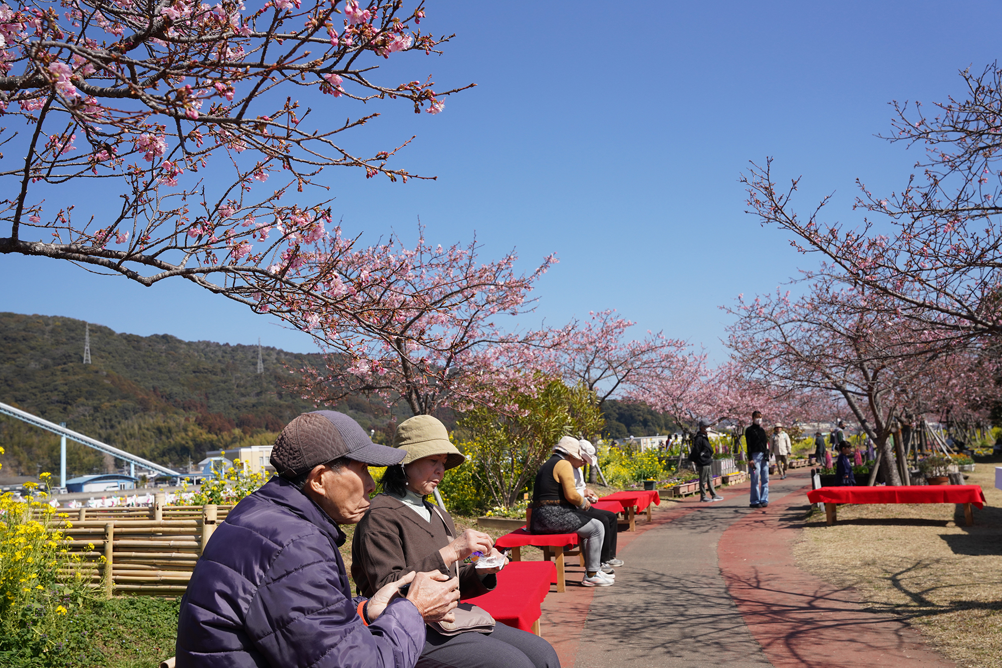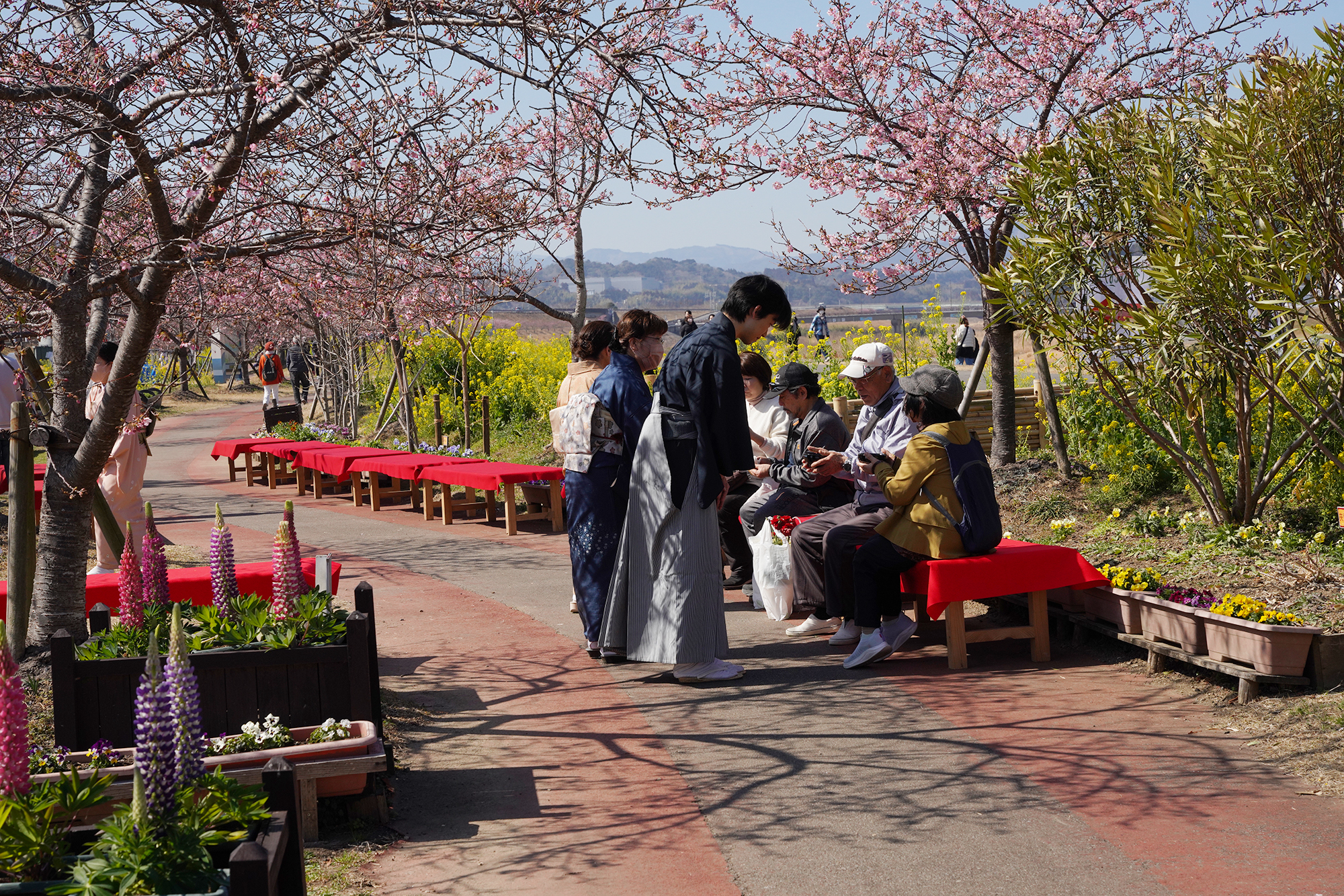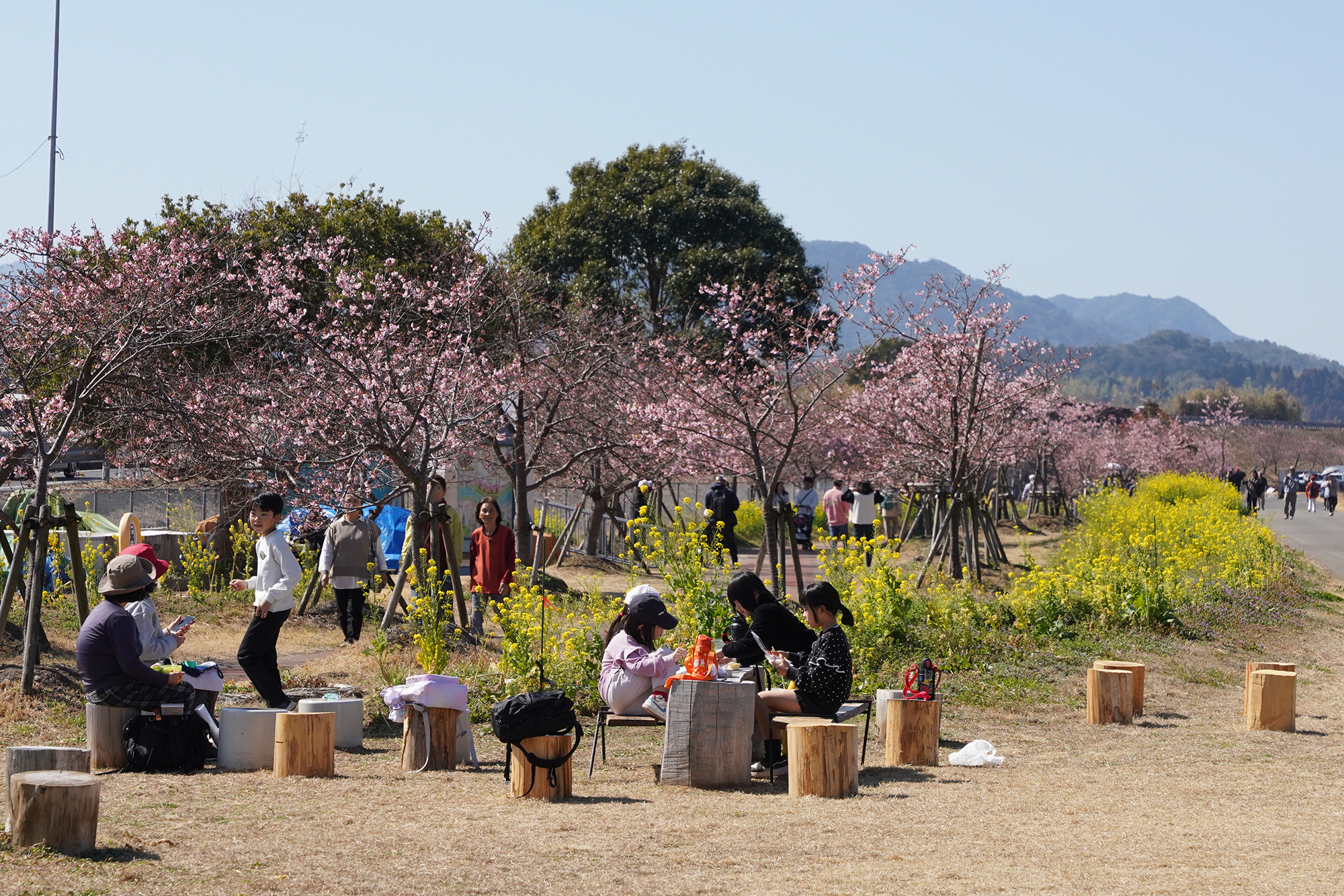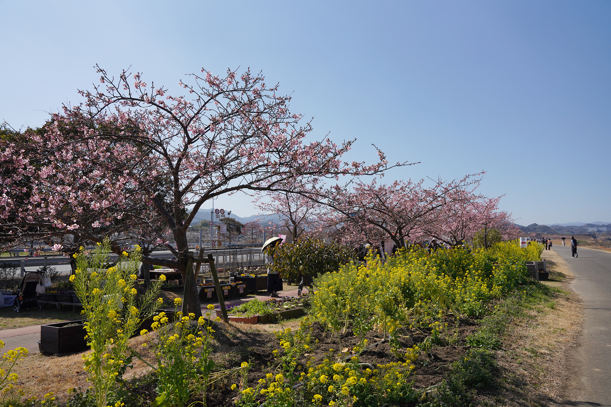 今年は1月後半から2月上旬までに覆われた大寒波の影響が心配されていましたが、開催前1週間は比較的温暖な日に恵まれ、開催当日には桜も9割ほどまで開花が進み、菜の花と鮮やかなピンク色の天下一ひむか桜(河津桜)のコラボレーションが訪れた人の目を楽しませていました。