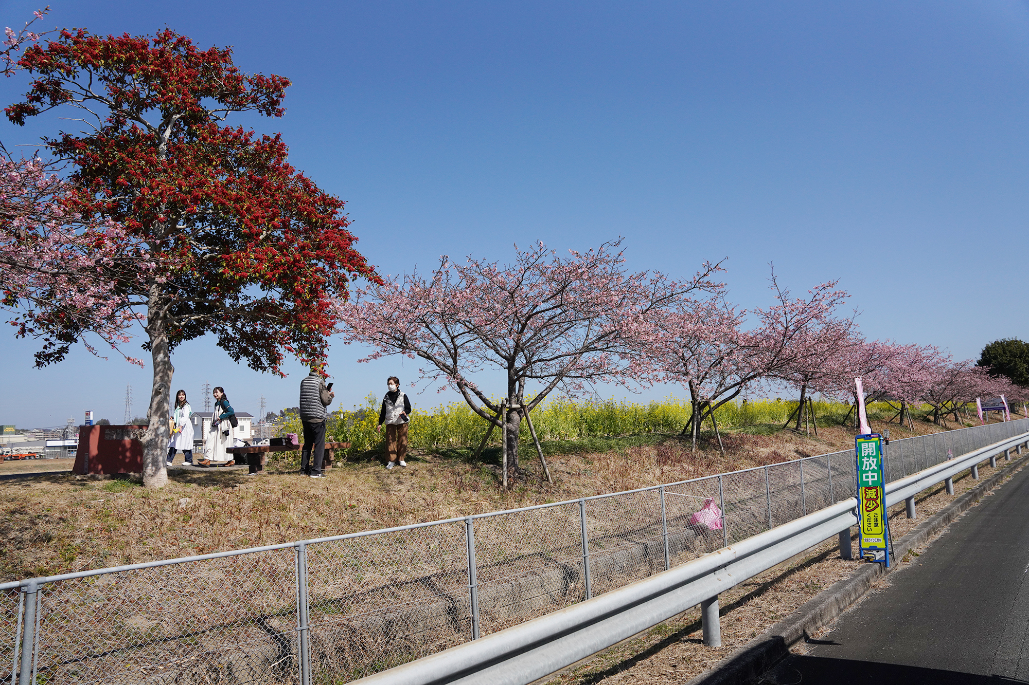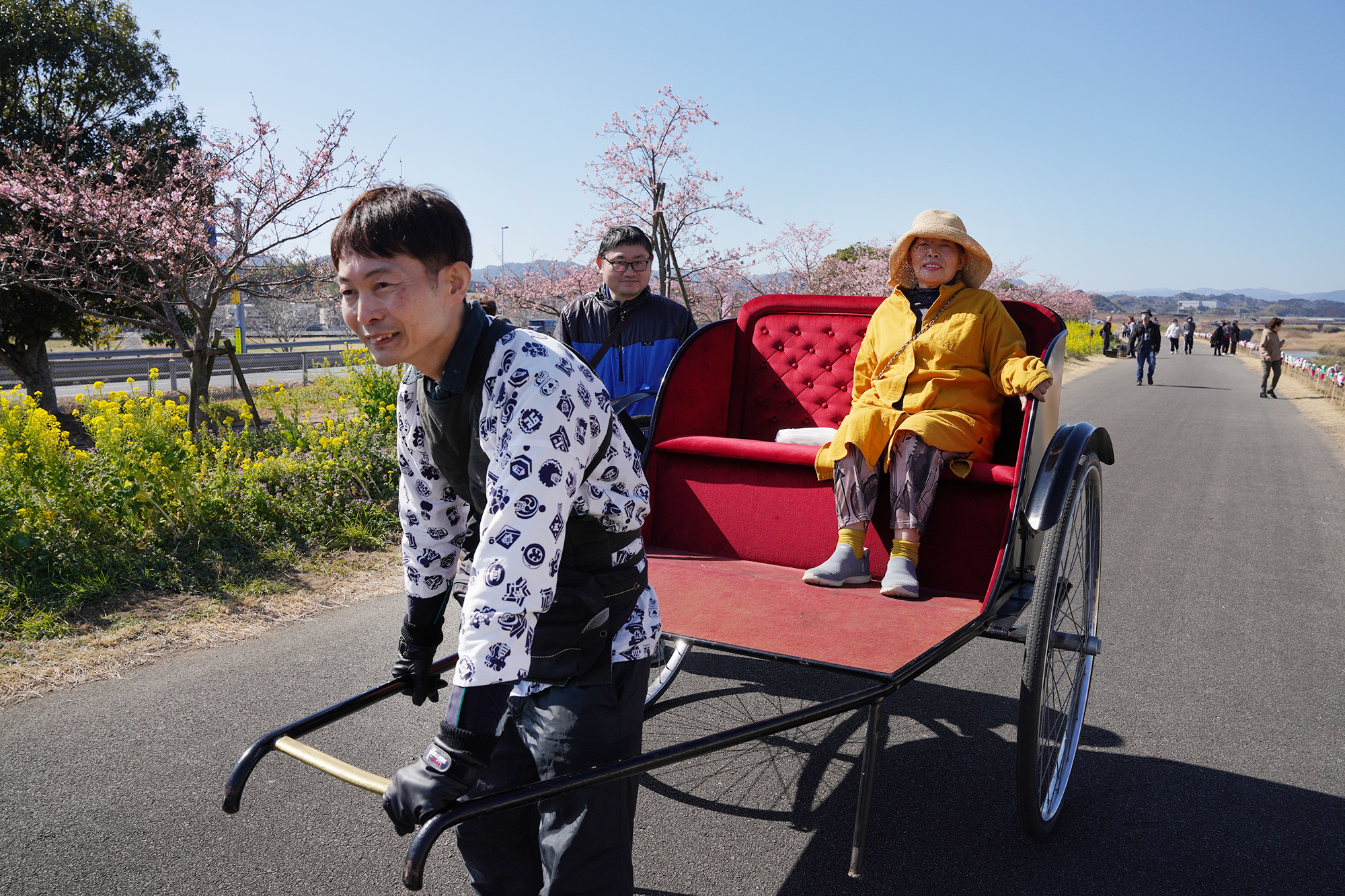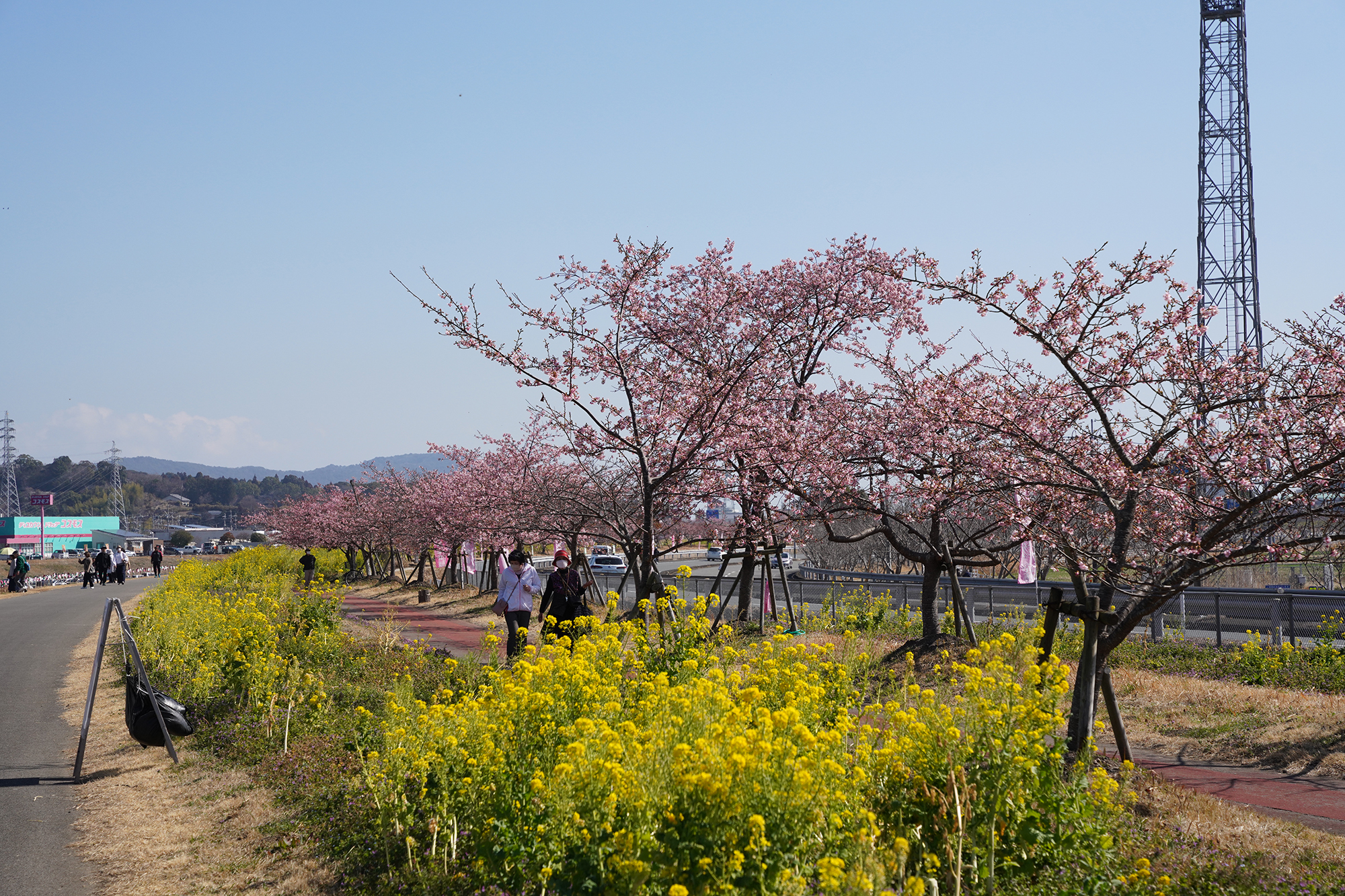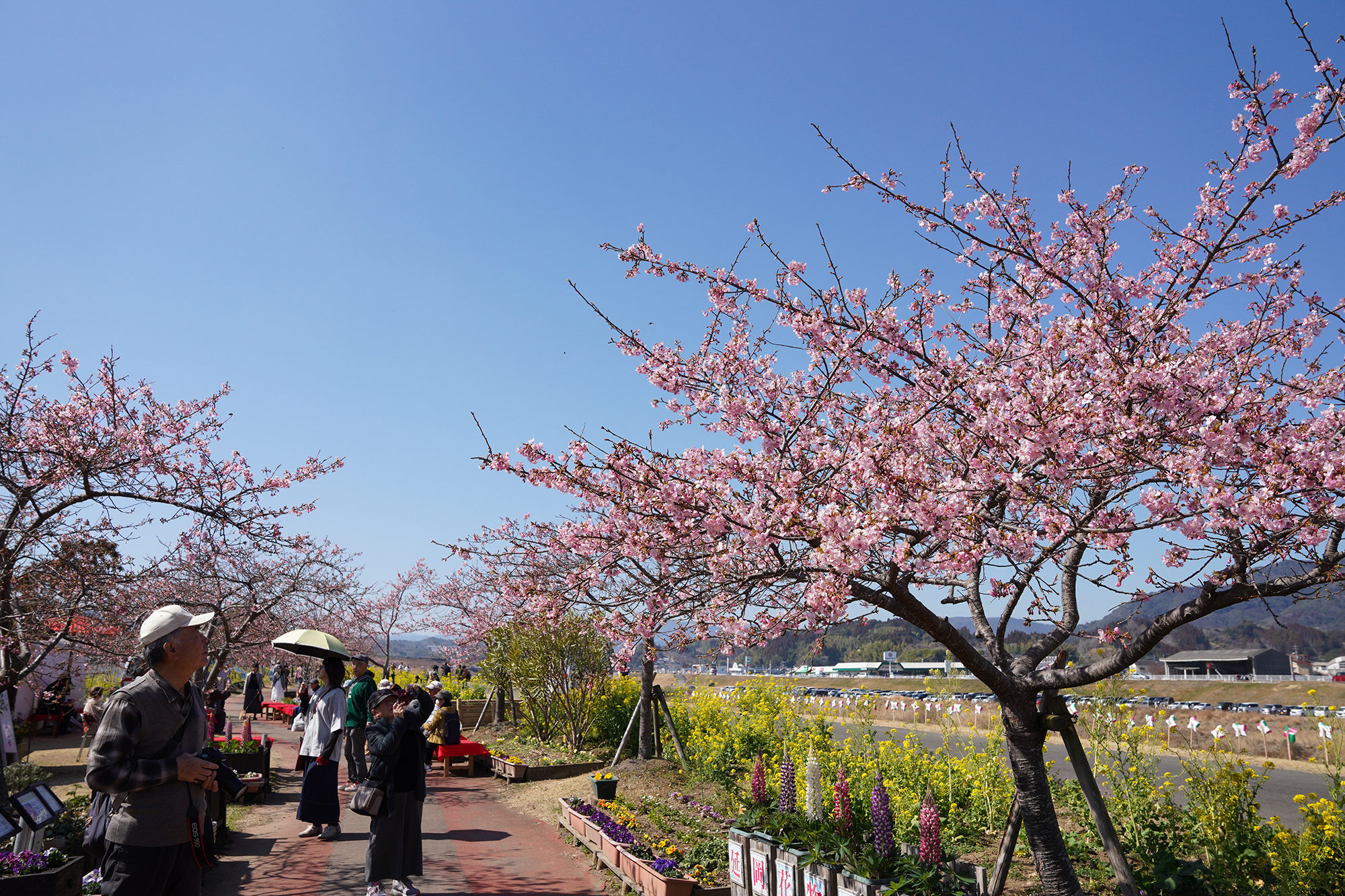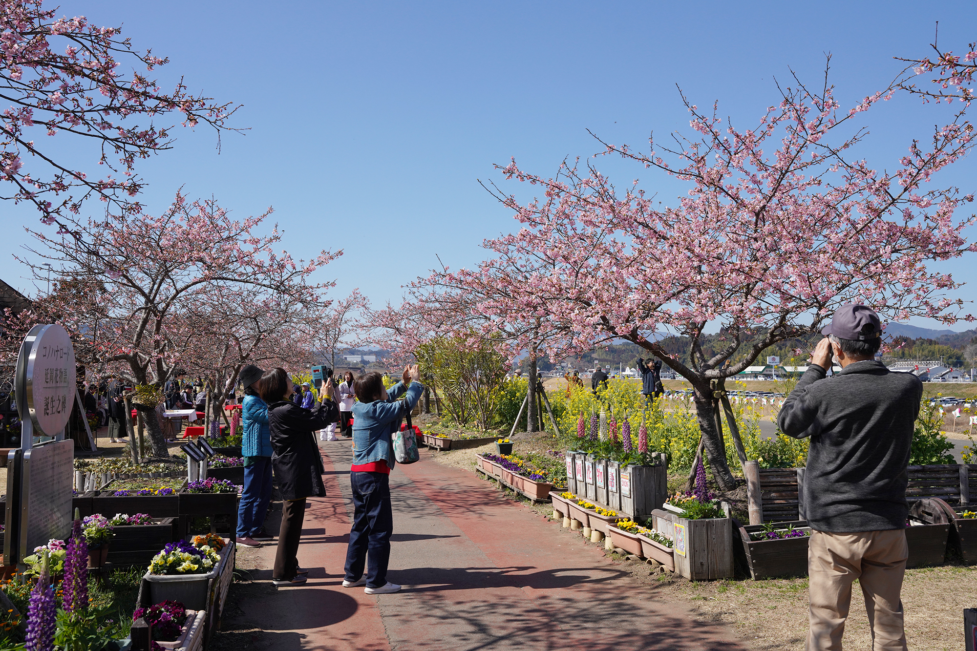 今年は1月後半から2月上旬までに覆われた大寒波の影響が心配されていましたが、開催前1週間は比較的温暖な日に恵まれ、開催当日には桜も9割ほどまで開花が進み、菜の花と鮮やかなピンク色の天下一ひむか桜(河津桜)のコラボレーションが訪れた人の目を楽しませていました。