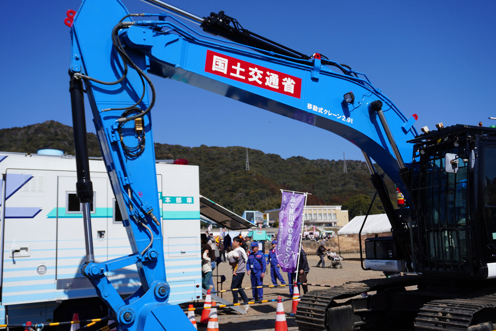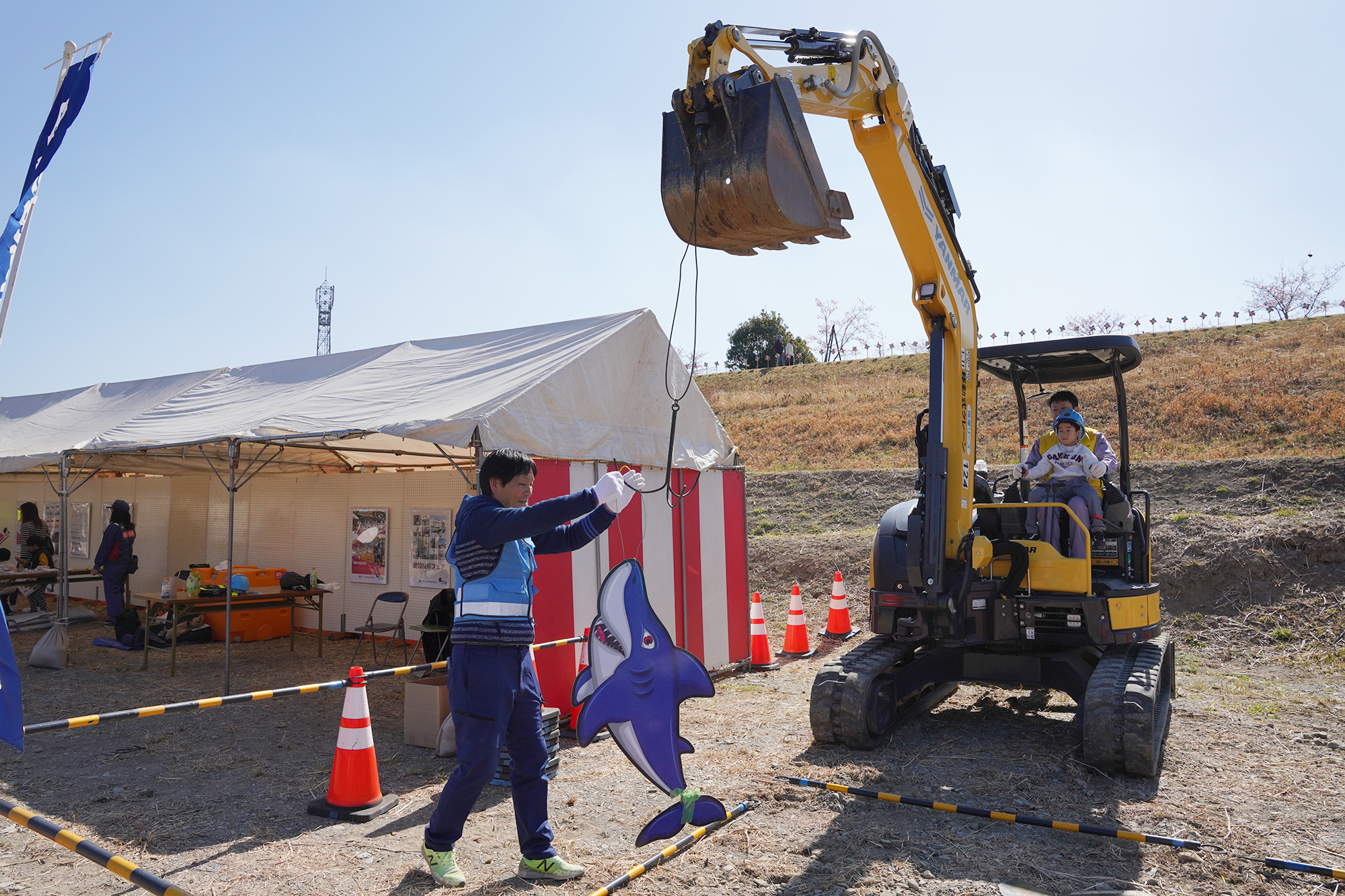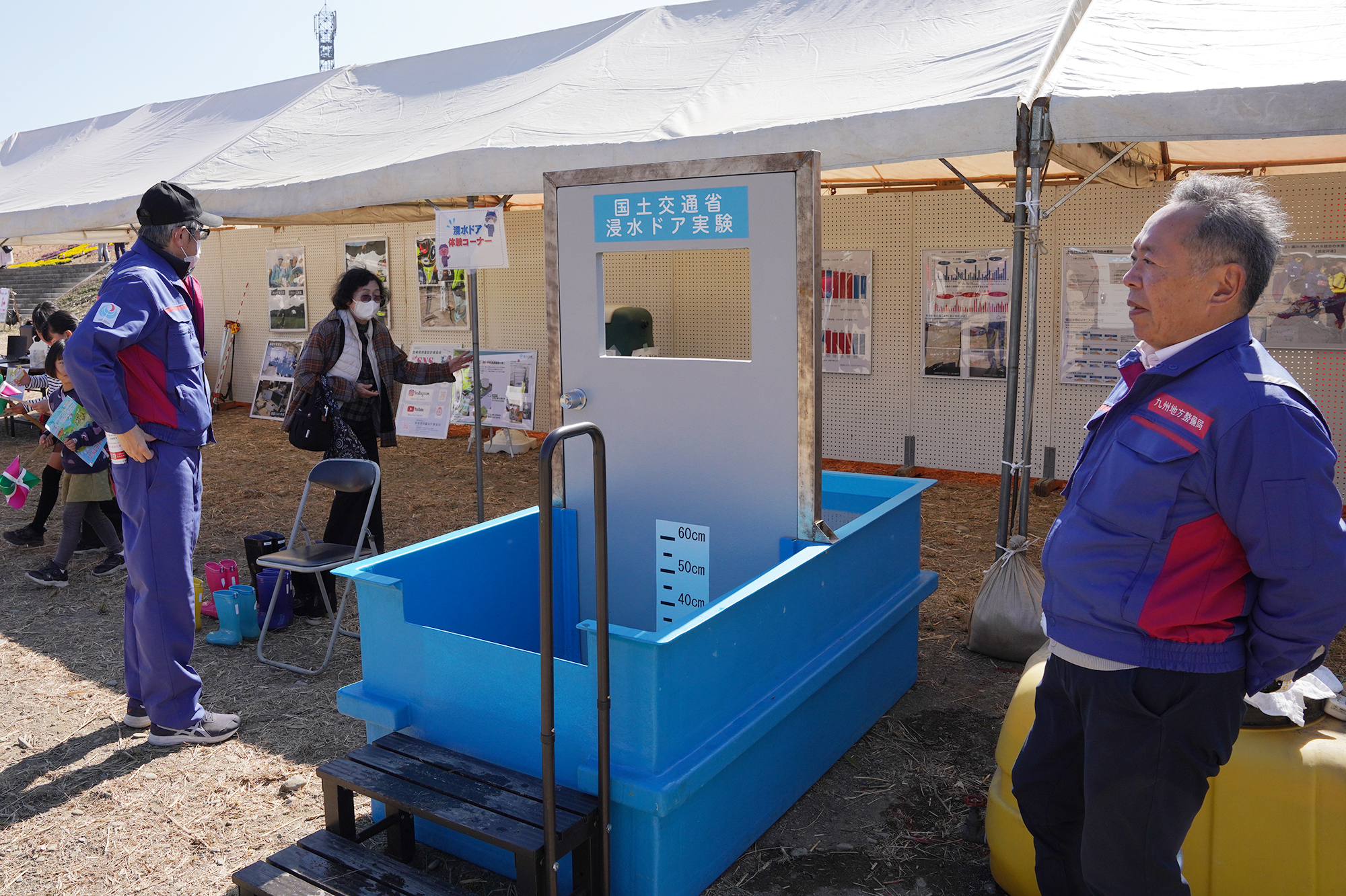 国土交通省 延岡河川国道事務所のブースでは、昨年に引き続き、土木業界PRを行なっています。ショベルカーに試乗したり、バーチャル映像の世界を体験できたり、浸水ドアで浸水時の水の圧力を体験したりなど、さまざまな体験コーナーがあります。