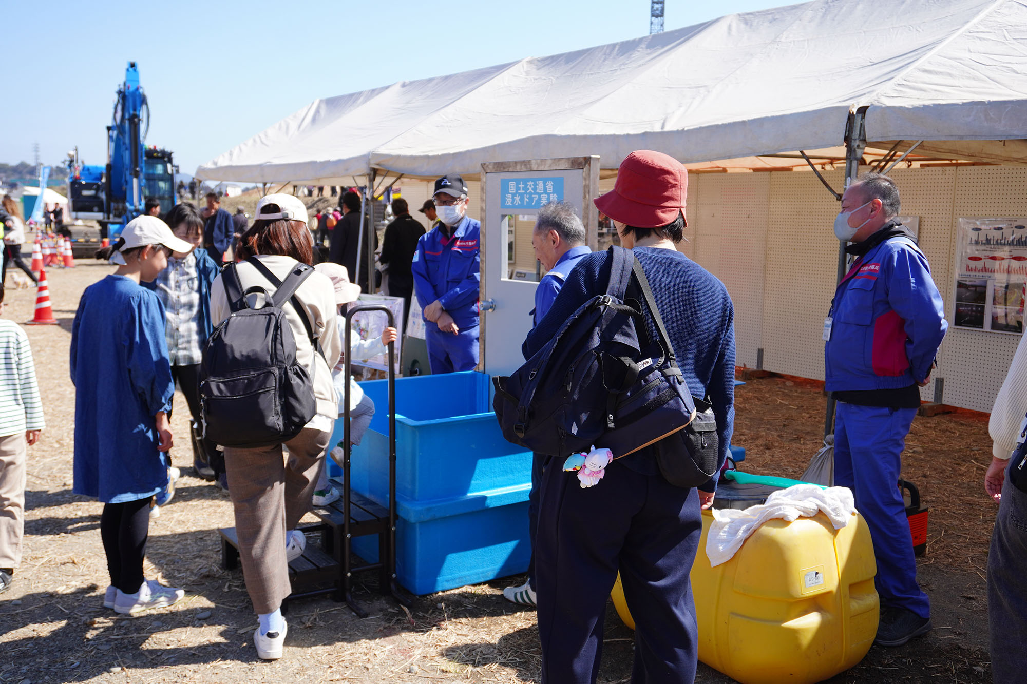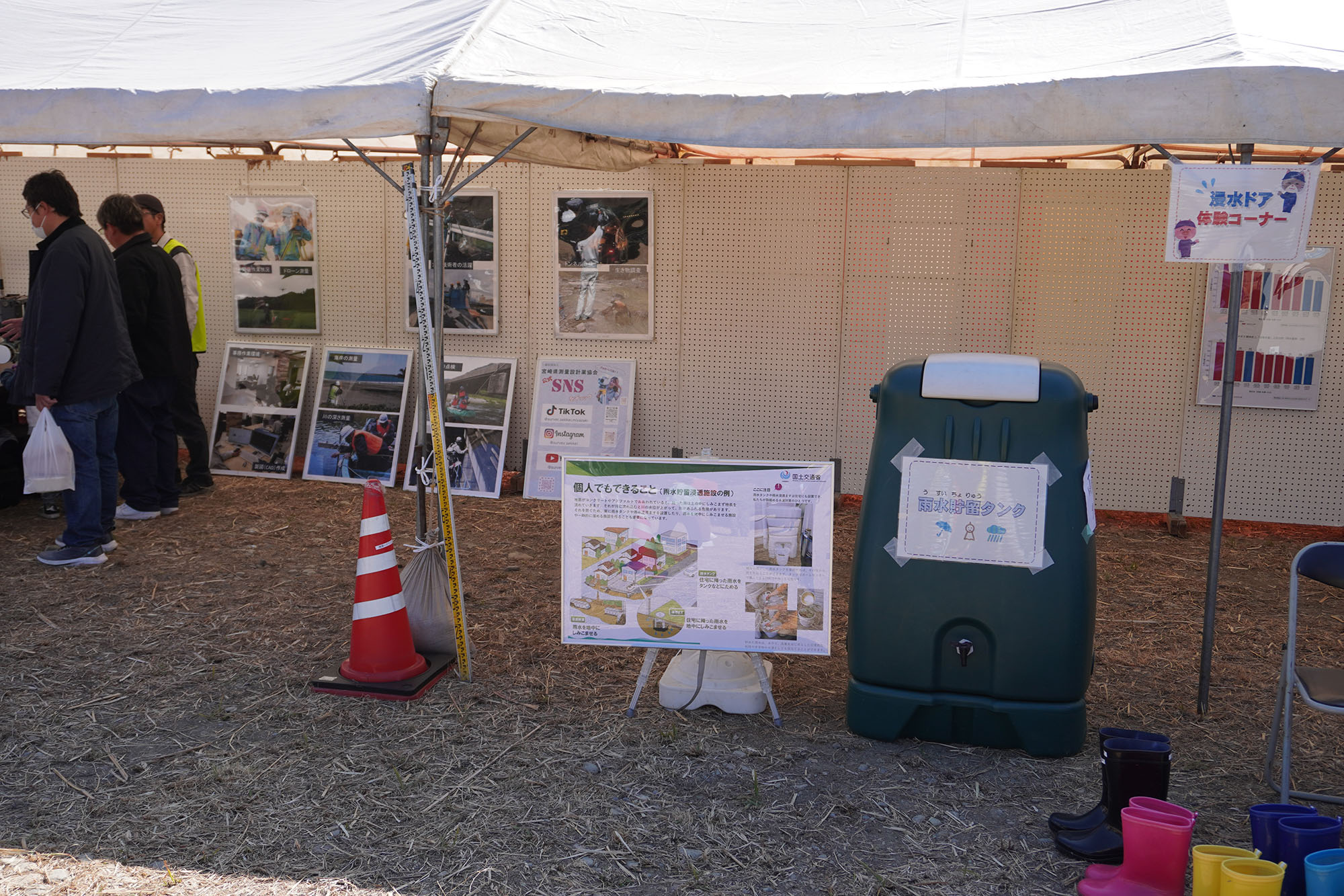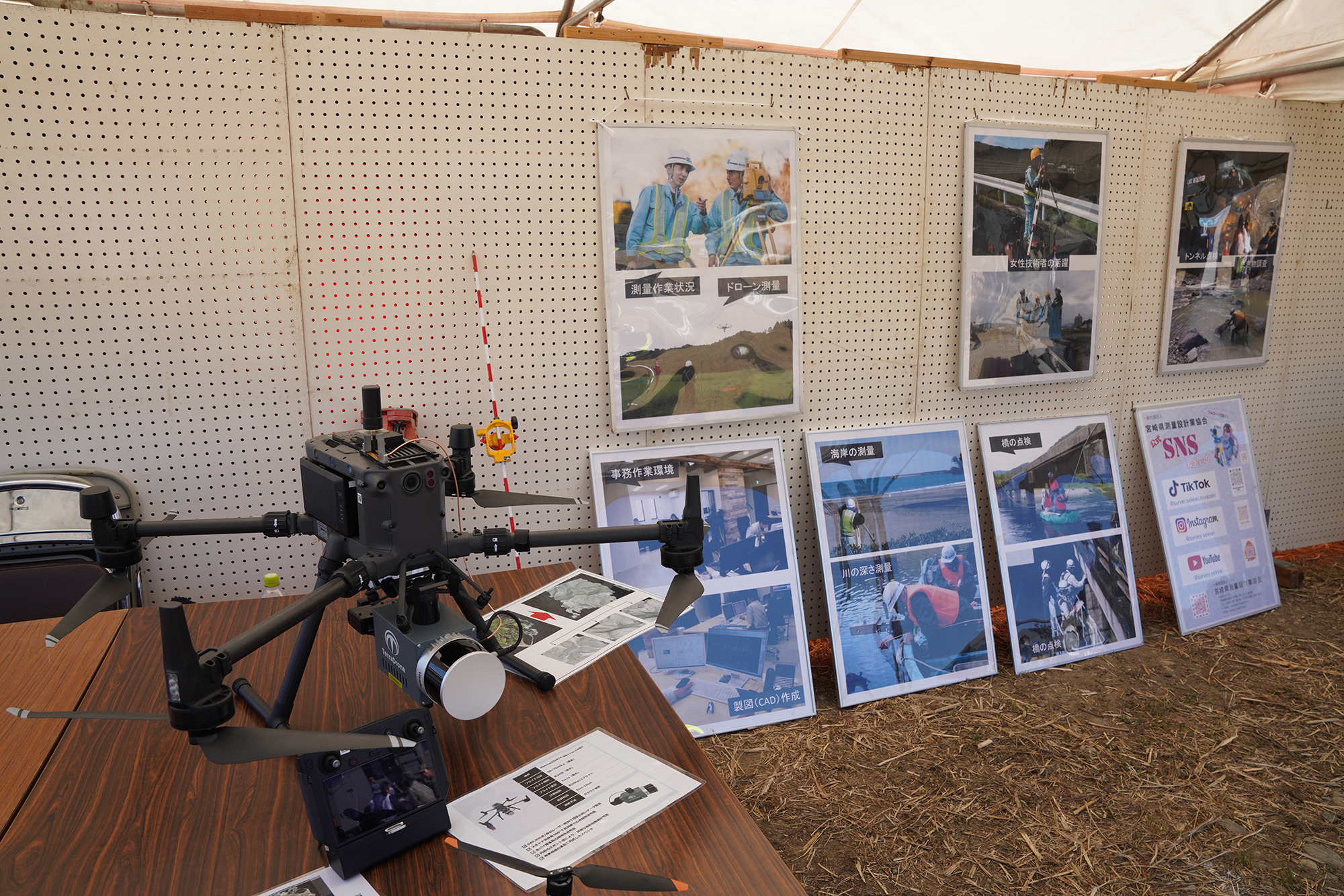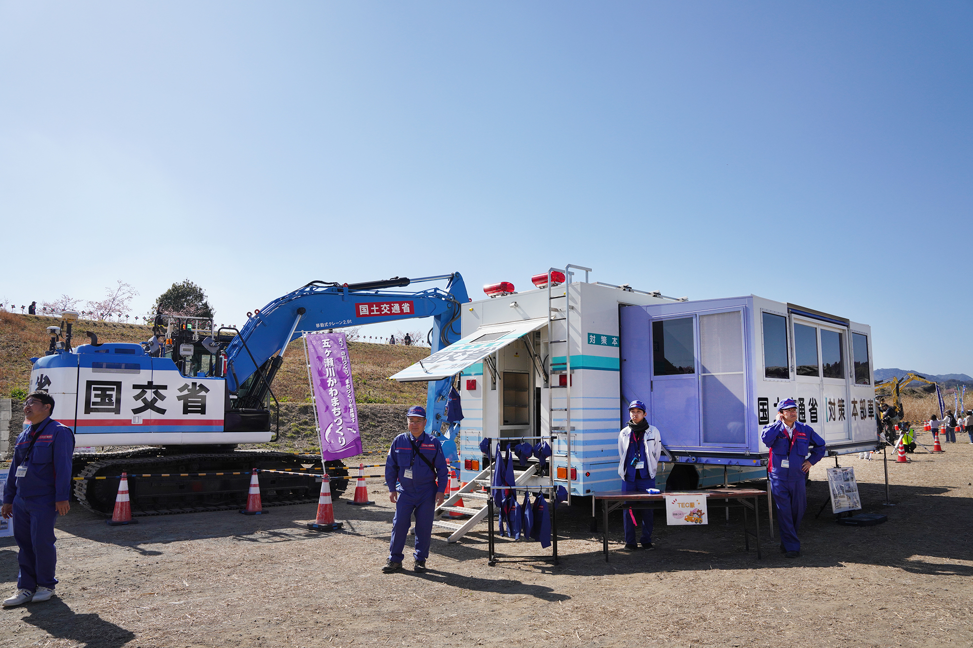 国土交通省 延岡河川国道事務所のブースでは、昨年に引き続き、土木業界PRを行なっています。ショベルカーに試乗したり、バーチャル映像の世界を体験できたり、浸水ドアで浸水時の水の圧力を体験したりなど、さまざまな体験コーナーがあります。