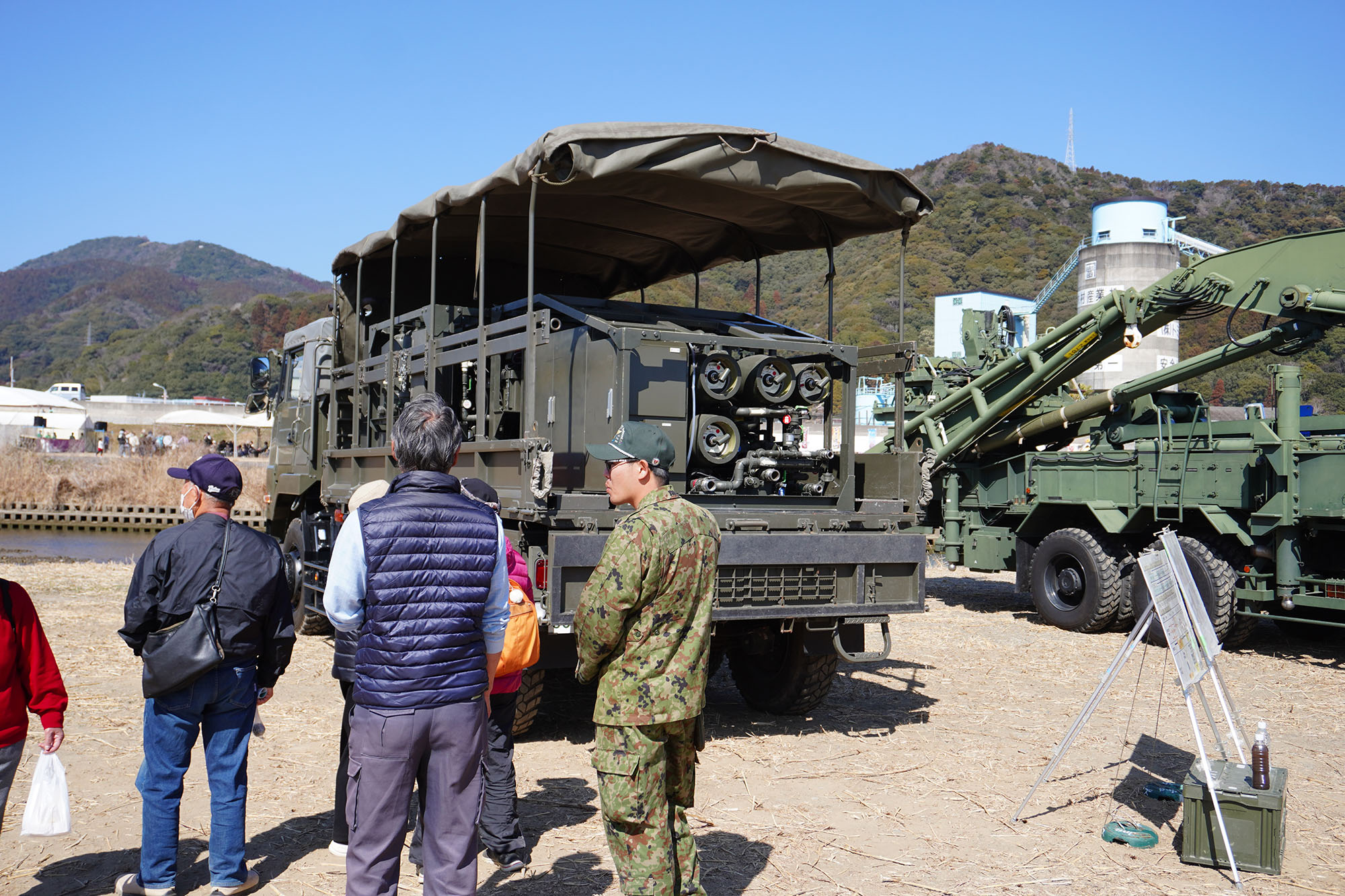 五ヶ瀬川に架けられた「このはな出逢い橋」は、自衛隊訓練として架けられた07式機動支援橋という装備品です。橋脚が不要な単径間橋を採用しており、河川の水量や流速及び河床土質の影響を受けることなく架設が可能です。自衛隊コーナーでは、その車両の展示のほか、熊本及びえびのから19(ひときゅう)式装輪自走155mmりゅう弾砲、浄水セット及び07式機動支援橋架設車の3両を展示。また、宮崎地方協力本部による自衛官募集相談コーナー、ミニ制服の試着コーナーもあります。