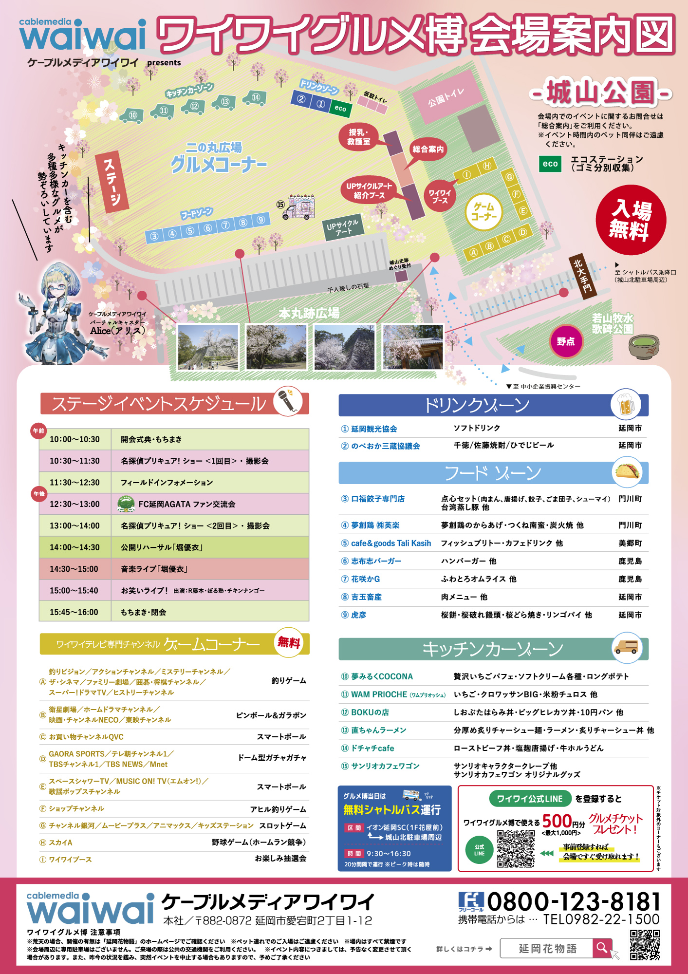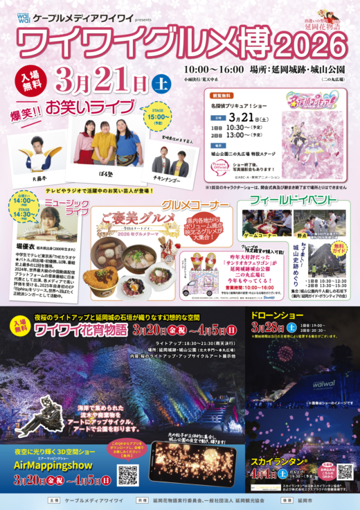 ワイワイグルメ博 詳細決定! 2026/03/13お知らせstaff イベント詳細は画像をクリックまたは下記PDFを御覧ください。 ※現在各所で配布されているチラシのドローンショー2回目の時間が実際の予定時間とことなっておりました。お詫びして訂正いたします。 ▶PDFはこちら