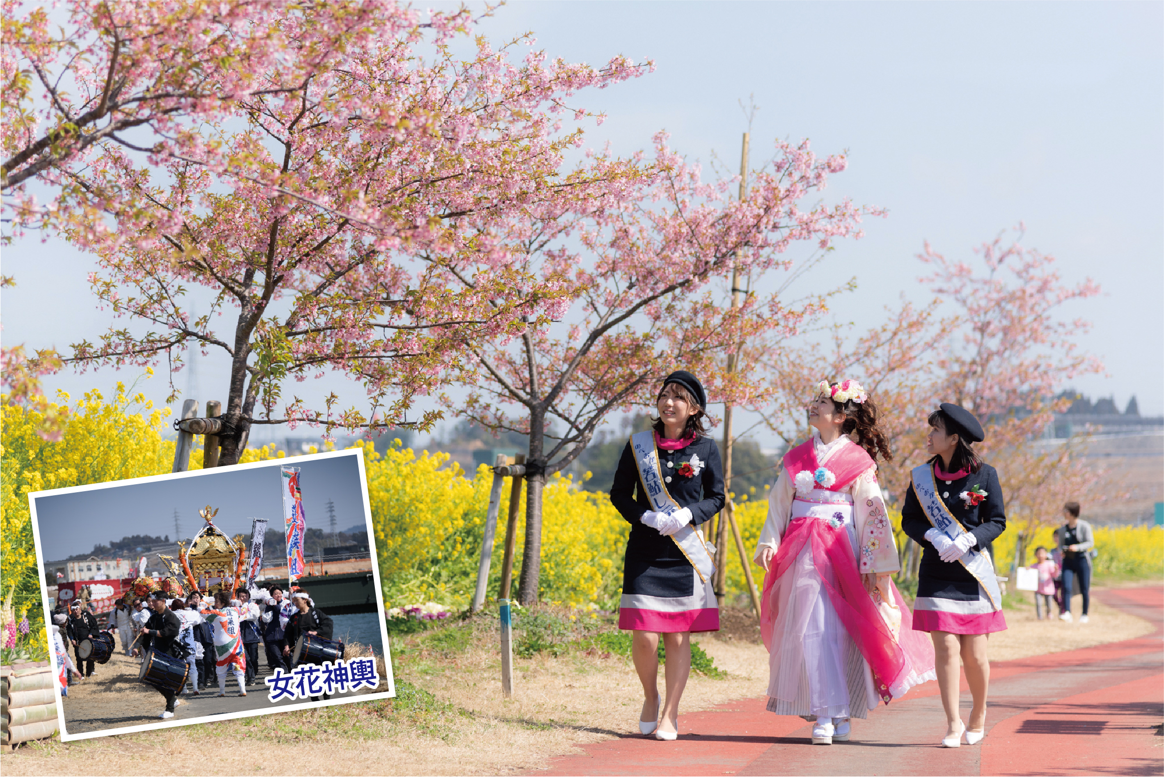 300本の天下一ひむか桜と100万本の菜の花が咲き誇る五ヶ瀬川堤防。特設ステージでは、郷土芸能をはじめ、歌謡ステージ他のパフォーマンスを楽しむことができる。また、河川敷には「のべおかうまいもの市」など美味しいものがずらり。さらに1,000本のかざぐるまが会場を彩る。